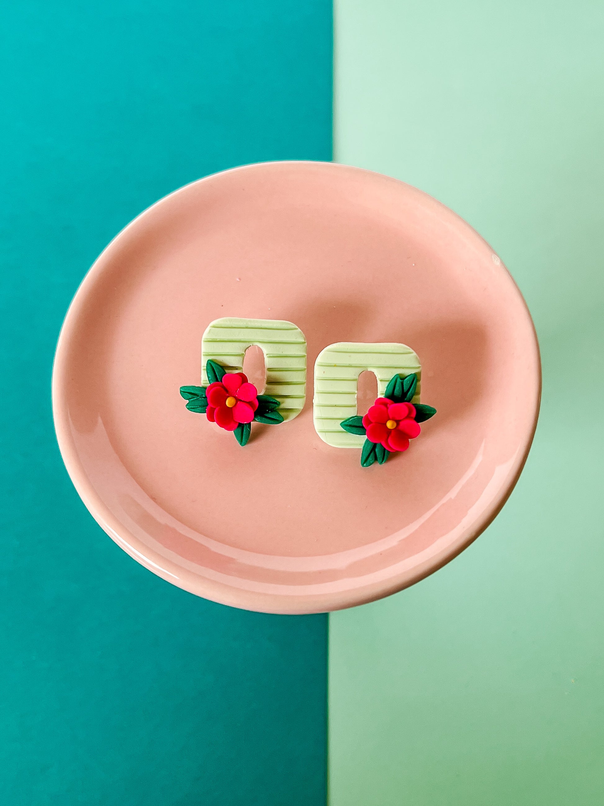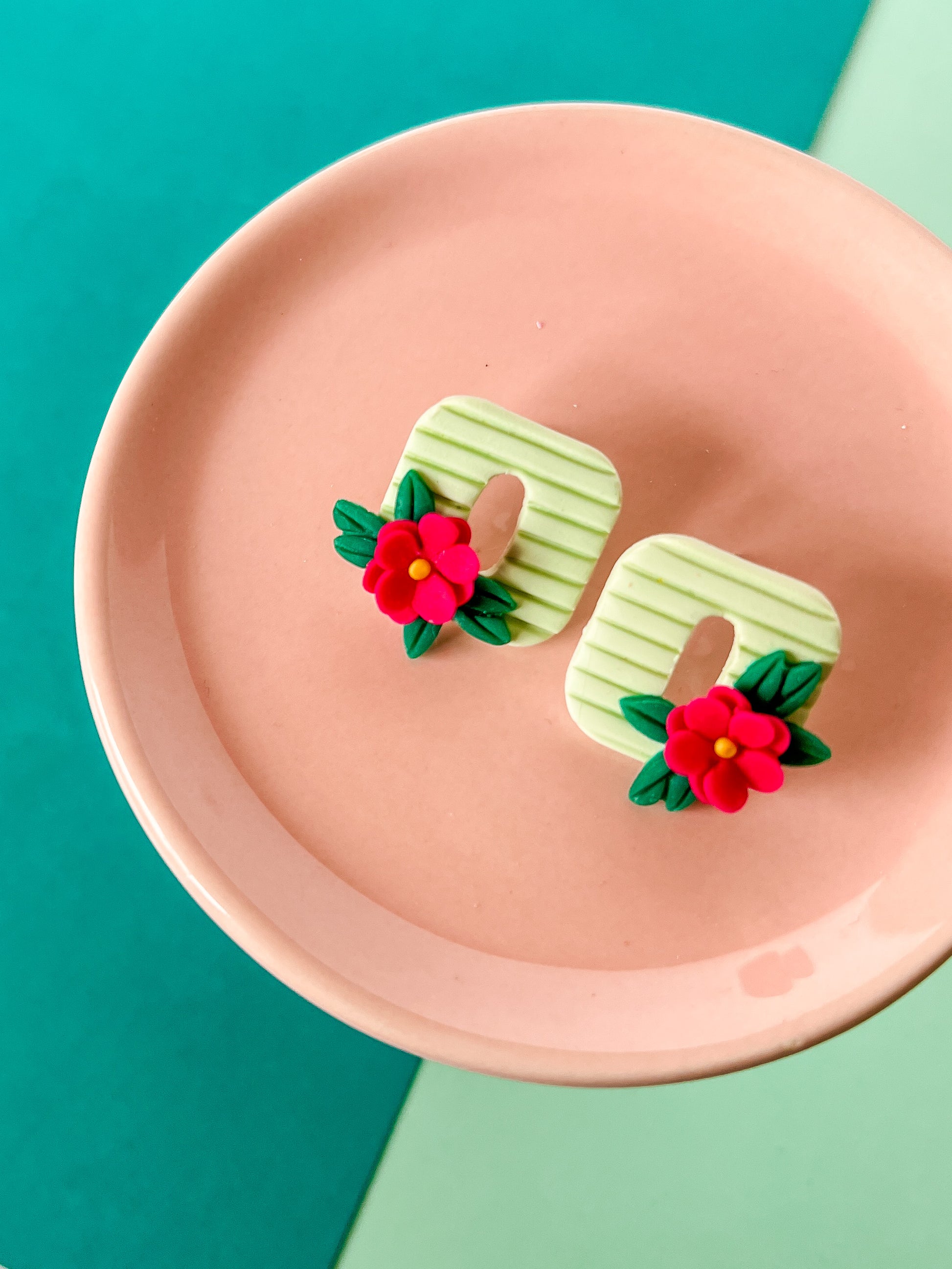 Our earrings are handmade in Greenville. South Carolina. Each item will have small variations and possible imperfections. Clay earrings are made start to finish from a block of clay. Each piece is unique. Each item is lovingly rolled out, cut, baked, sanded and assembled by hand from polymer clay.