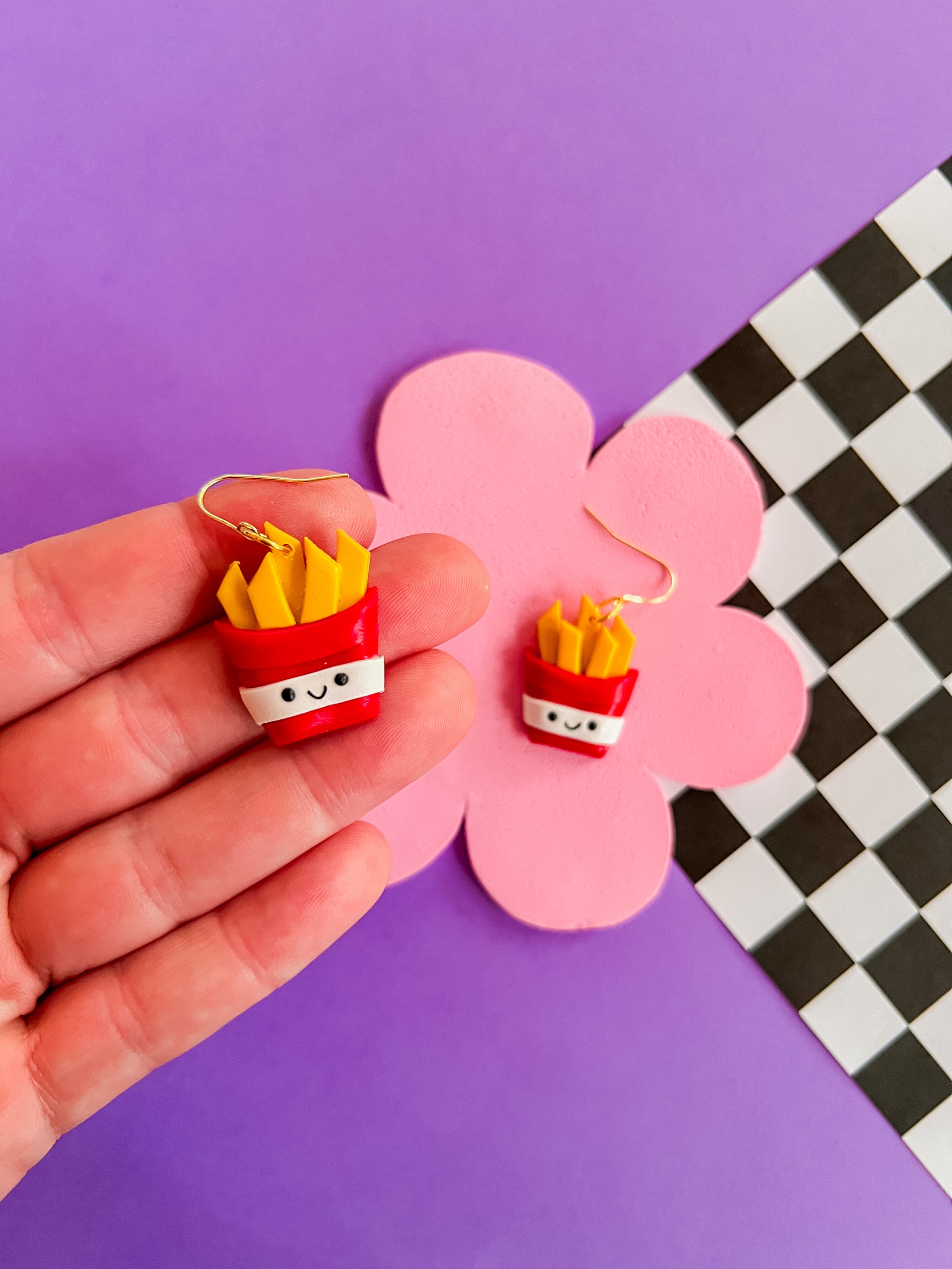 Our earrings are handmade in Greenville. South Carolina. Each item will have small variations and possible imperfections. Clay earrings are made start to finish from a block of clay. Each piece is unique. Each item is lovingly rolled out, cut, baked, sanded and assembled by hand from polymer clay.