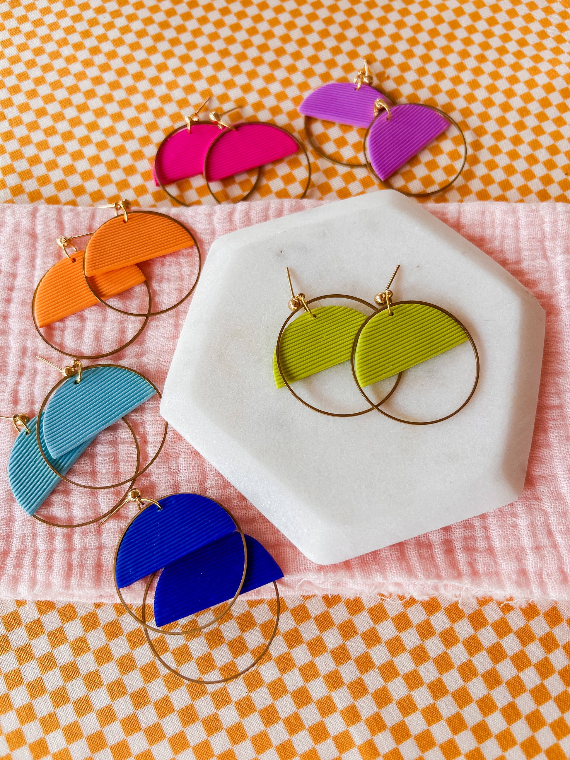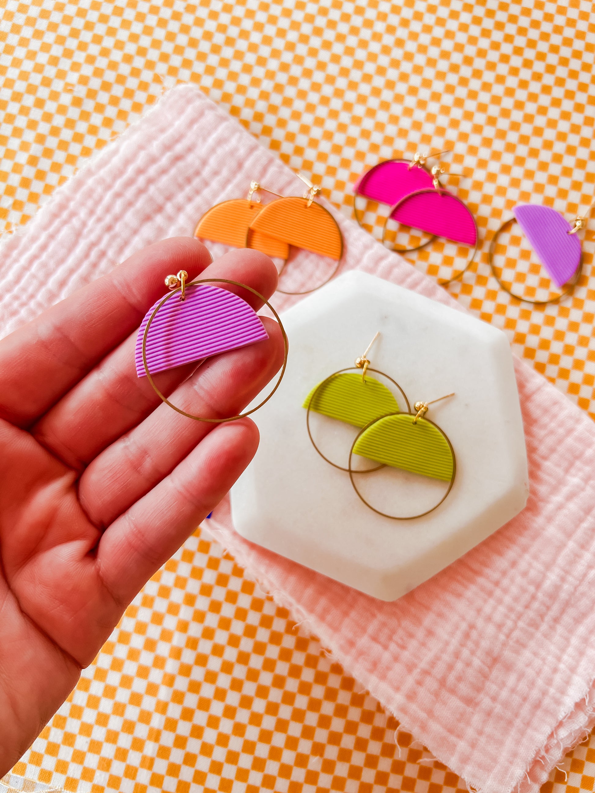 Our earrings are handmade in Greenville. South Carolina. Each item will have small variations and possible imperfections. Clay earrings are made start to finish from a block of clay. Each piece is unique. Each item is lovingly rolled out, cut, baked, sanded and assembled by hand from polymer clay.