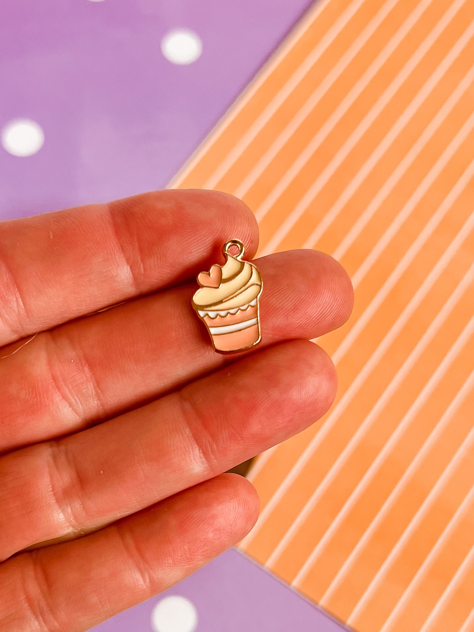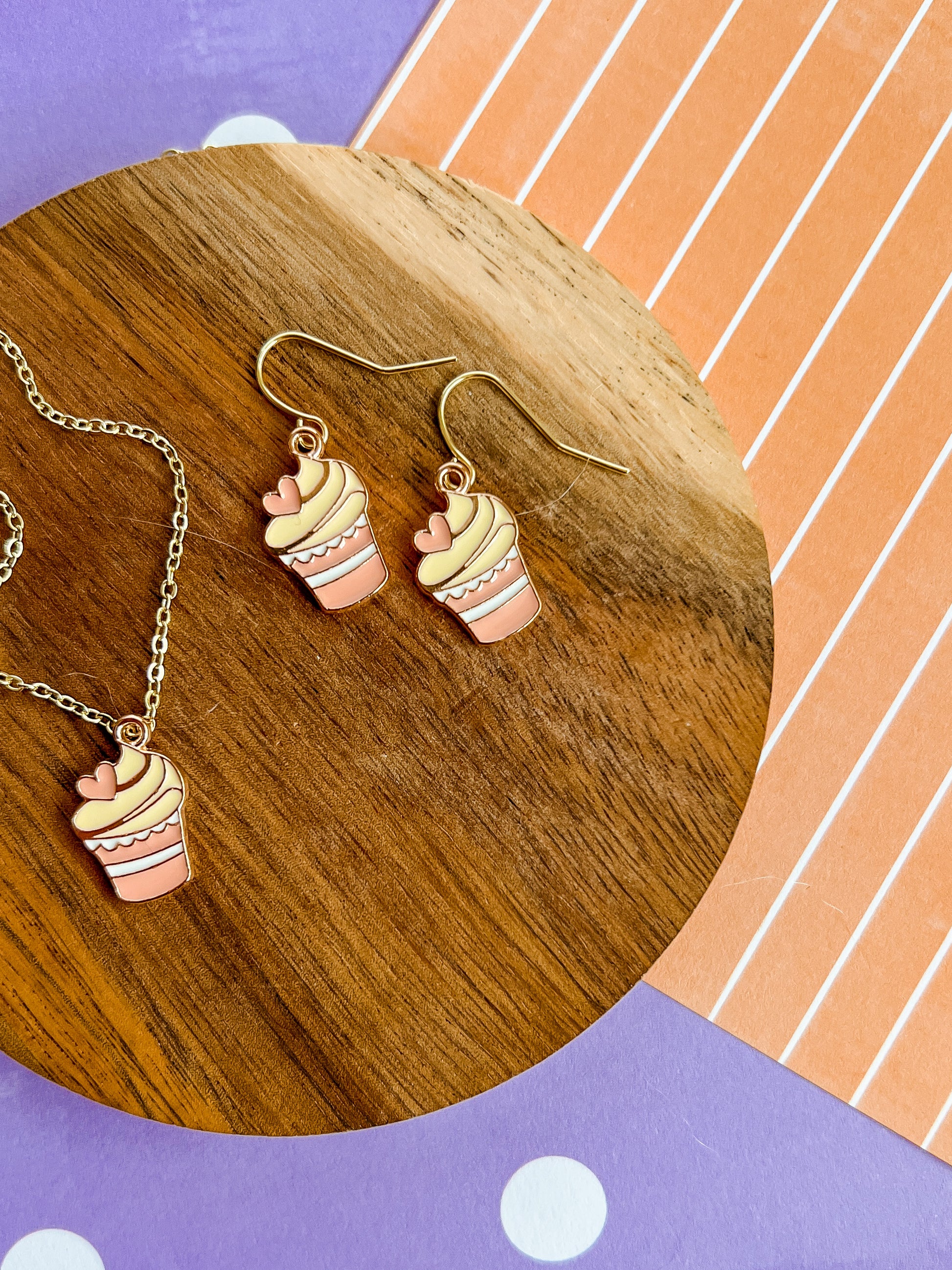 This is our Heart Cupcake set! She comes on a 16" gold plated chain, earrings (even clip ons!) or the whole set. If you need a different necklace length send us an email or let us know at check out!