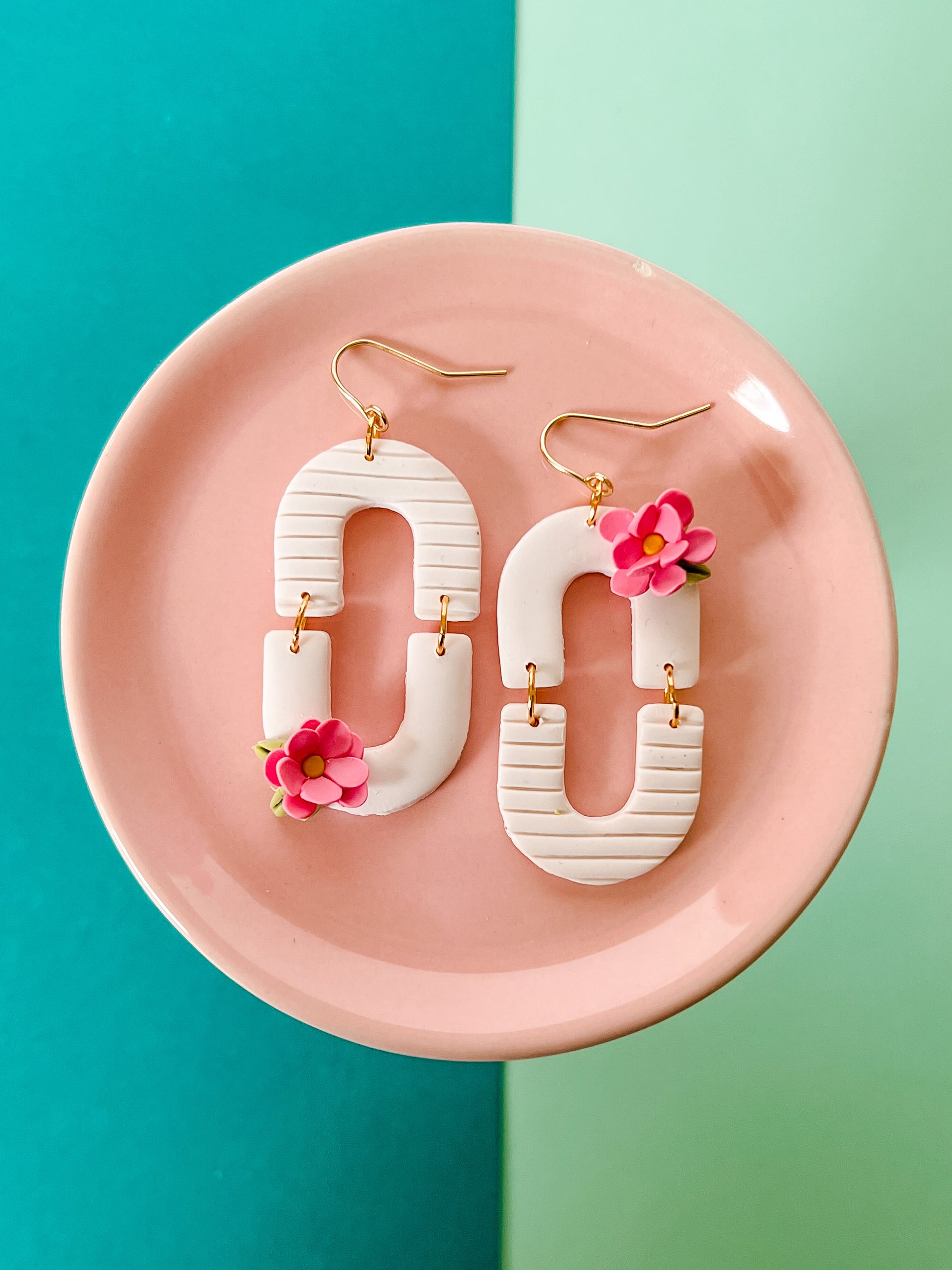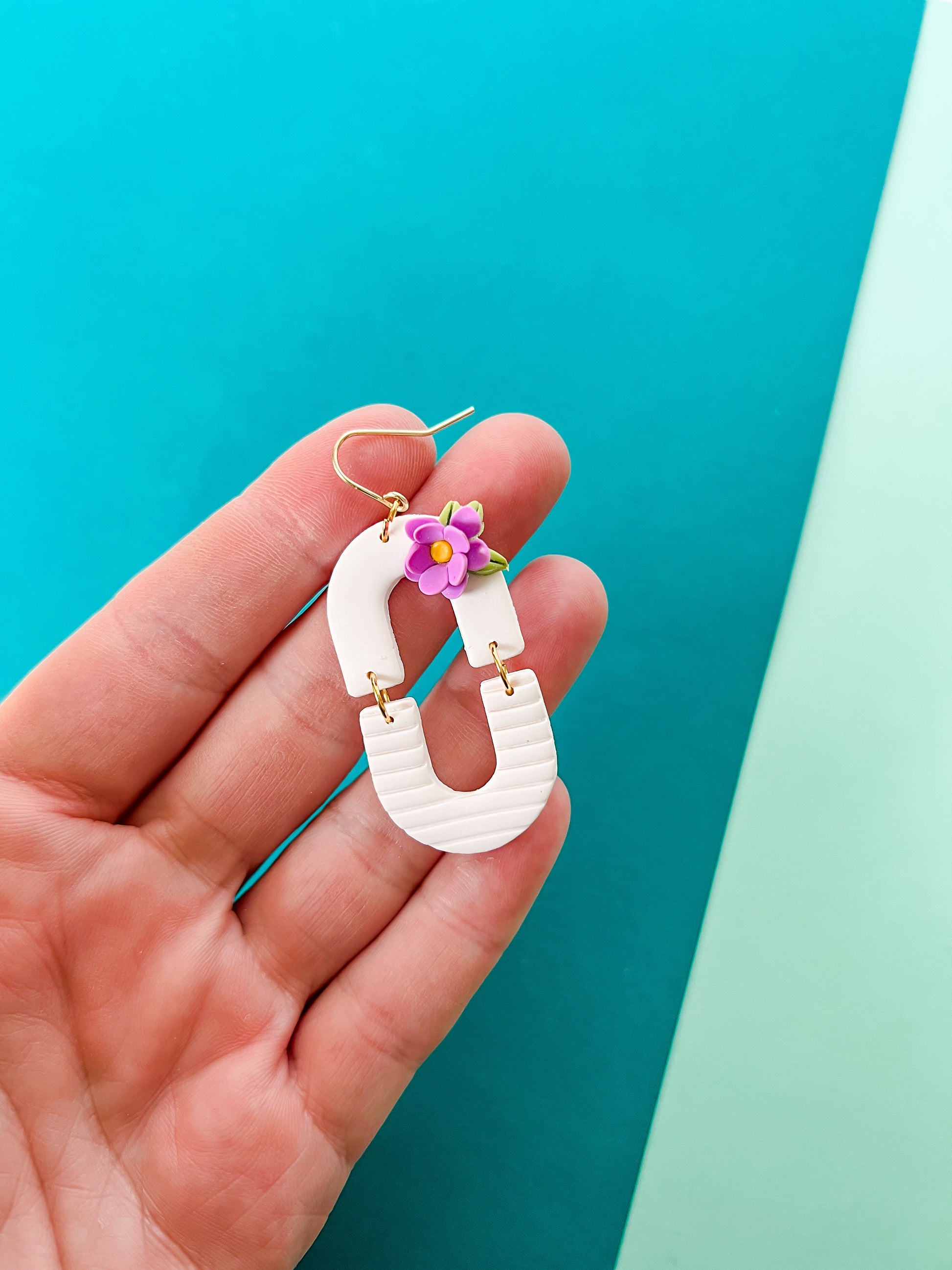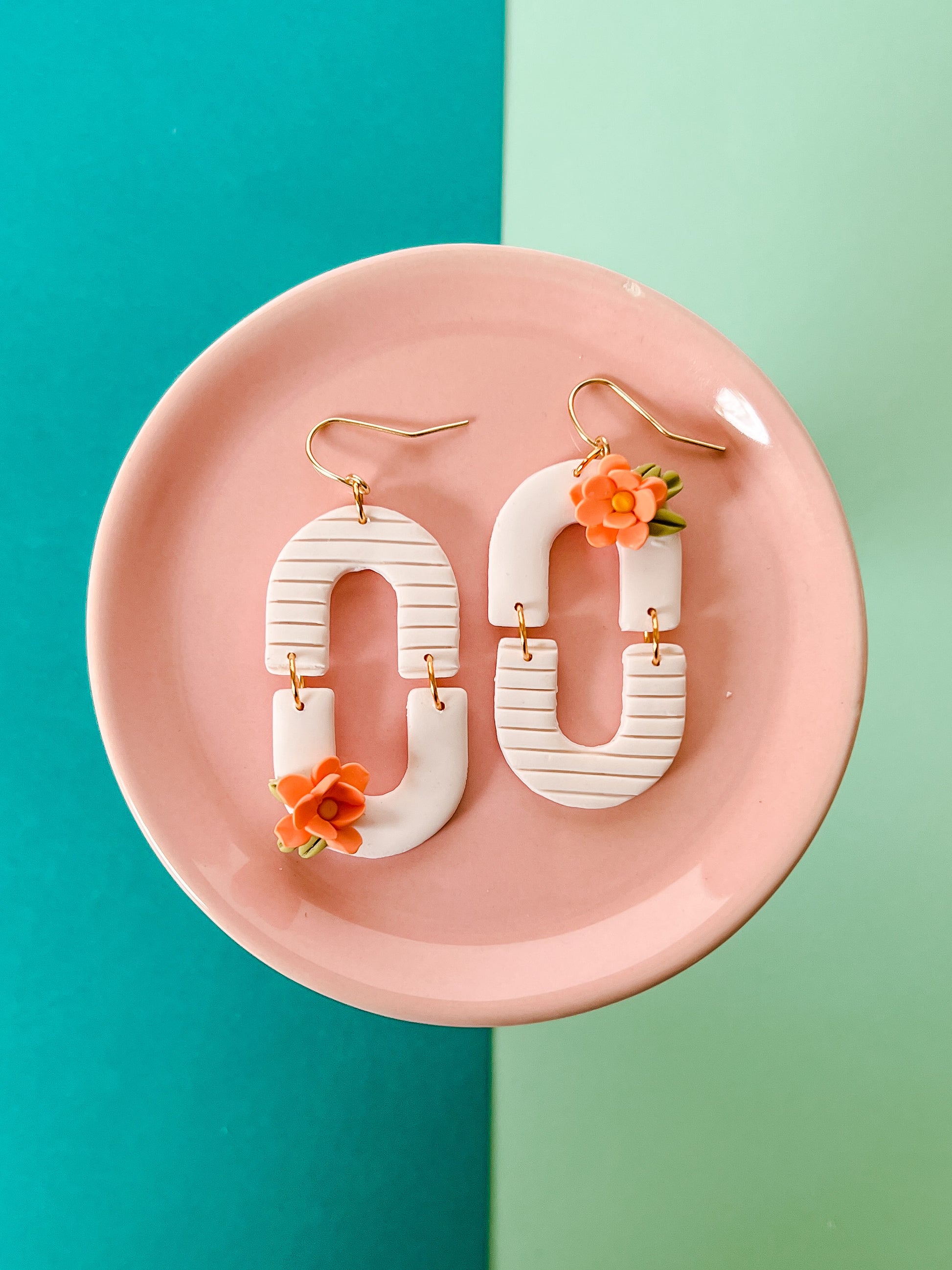 Our earrings are handmade in Greenville. South Carolina. Each item will have small variations and possible imperfections. Clay earrings are made start to finish from a block of clay. Each piece is unique. Each item is lovingly rolled out, cut, baked, sanded and assembled by hand from polymer clay. Polymer clay is durable and light weight, however should be handled with care. They can be scratched so be sure to keep them in a safe dry place. The ear wires are gold plated. Though they are durable, it's best not to bend them.