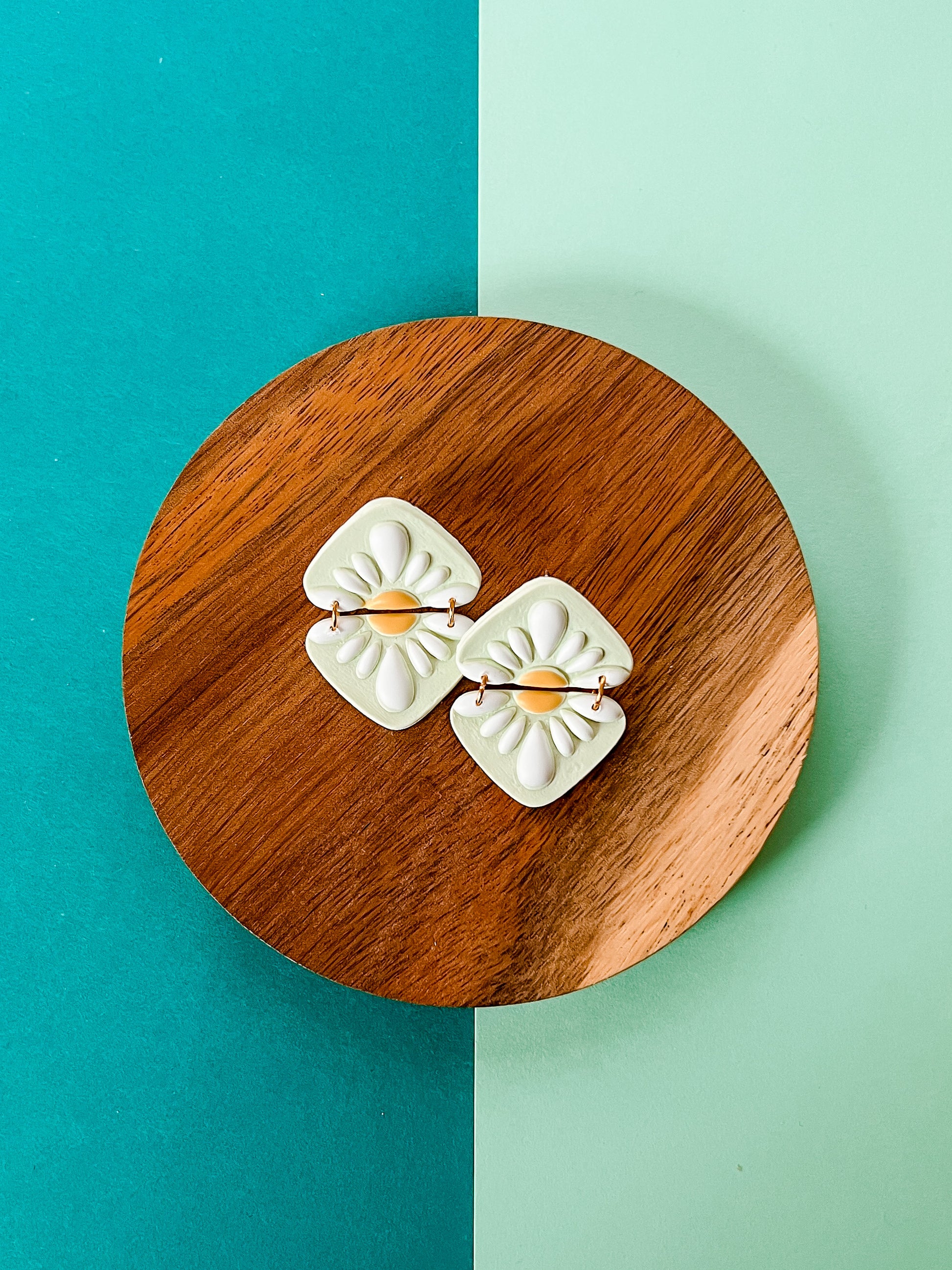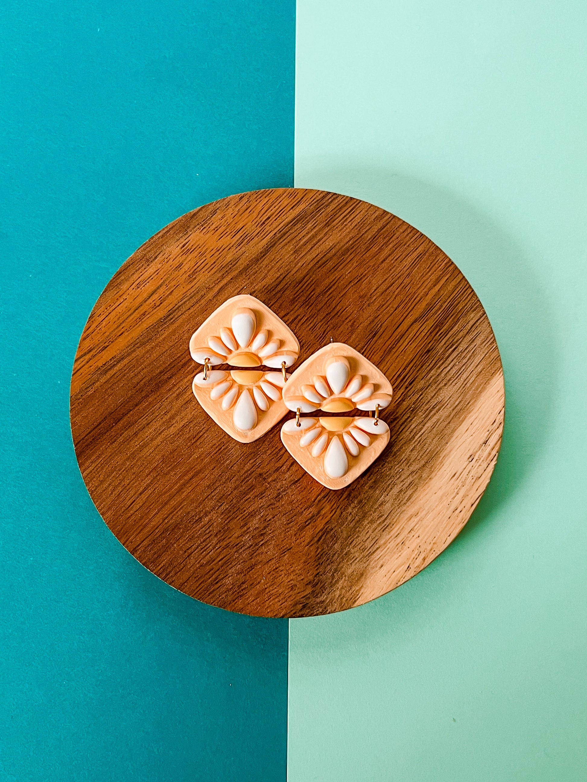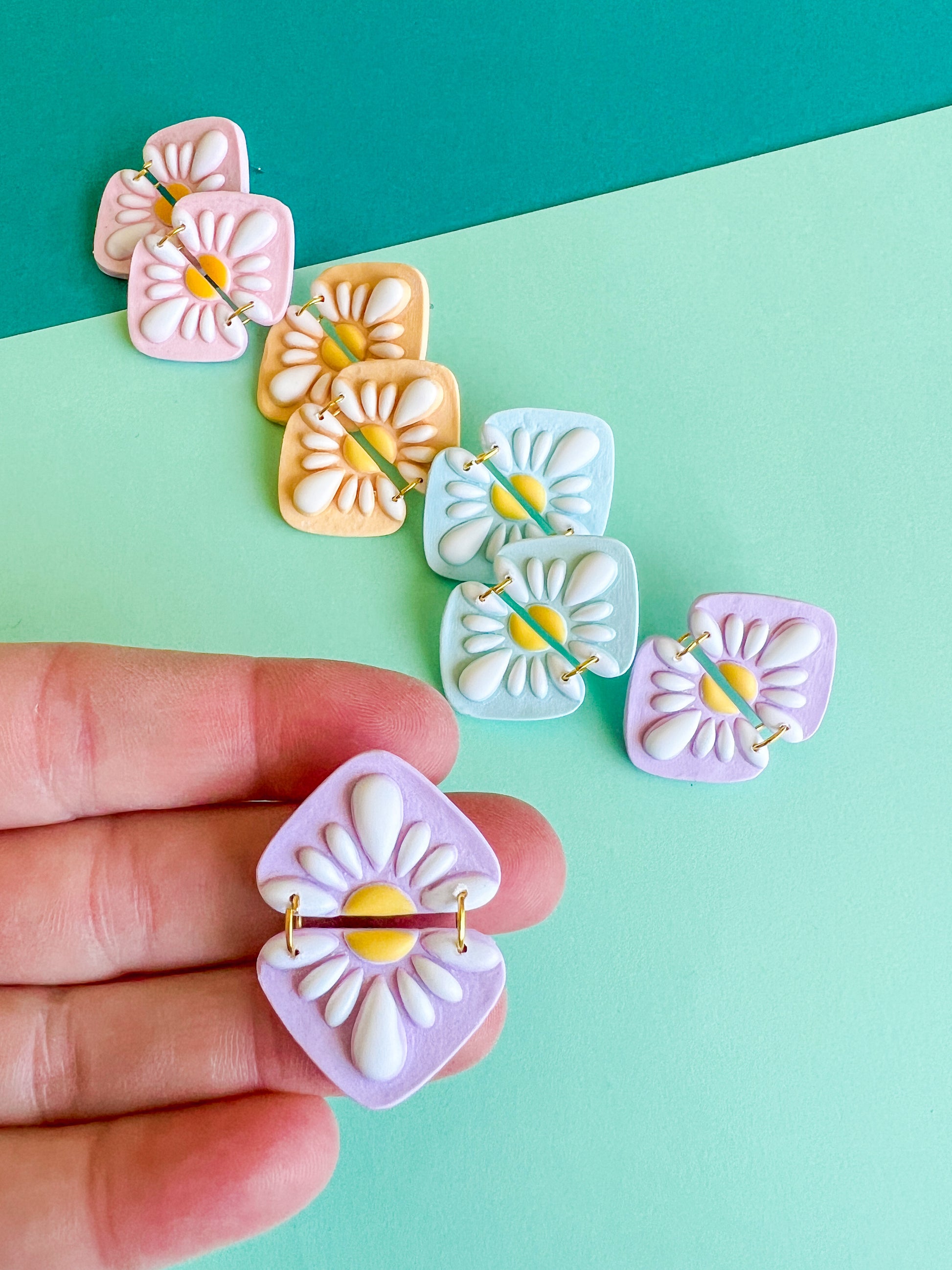 Our earrings are handmade in Greenville. South Carolina. Each item will have small variations and possible imperfections. Clay earrings are made start to finish from a block of clay. Each piece is unique. Each item is lovingly rolled out, cut, baked, sanded and assembled by hand from polymer clay.