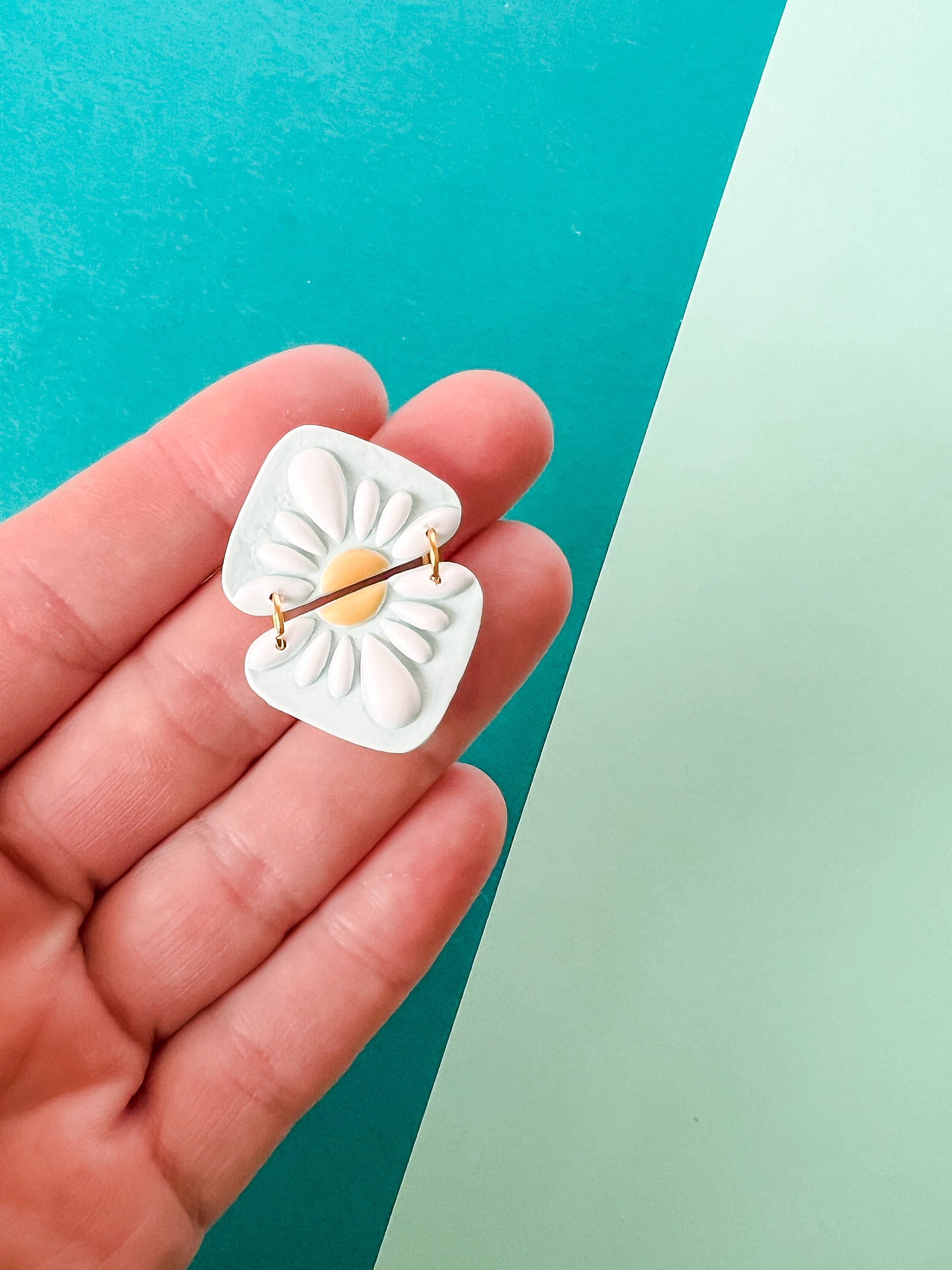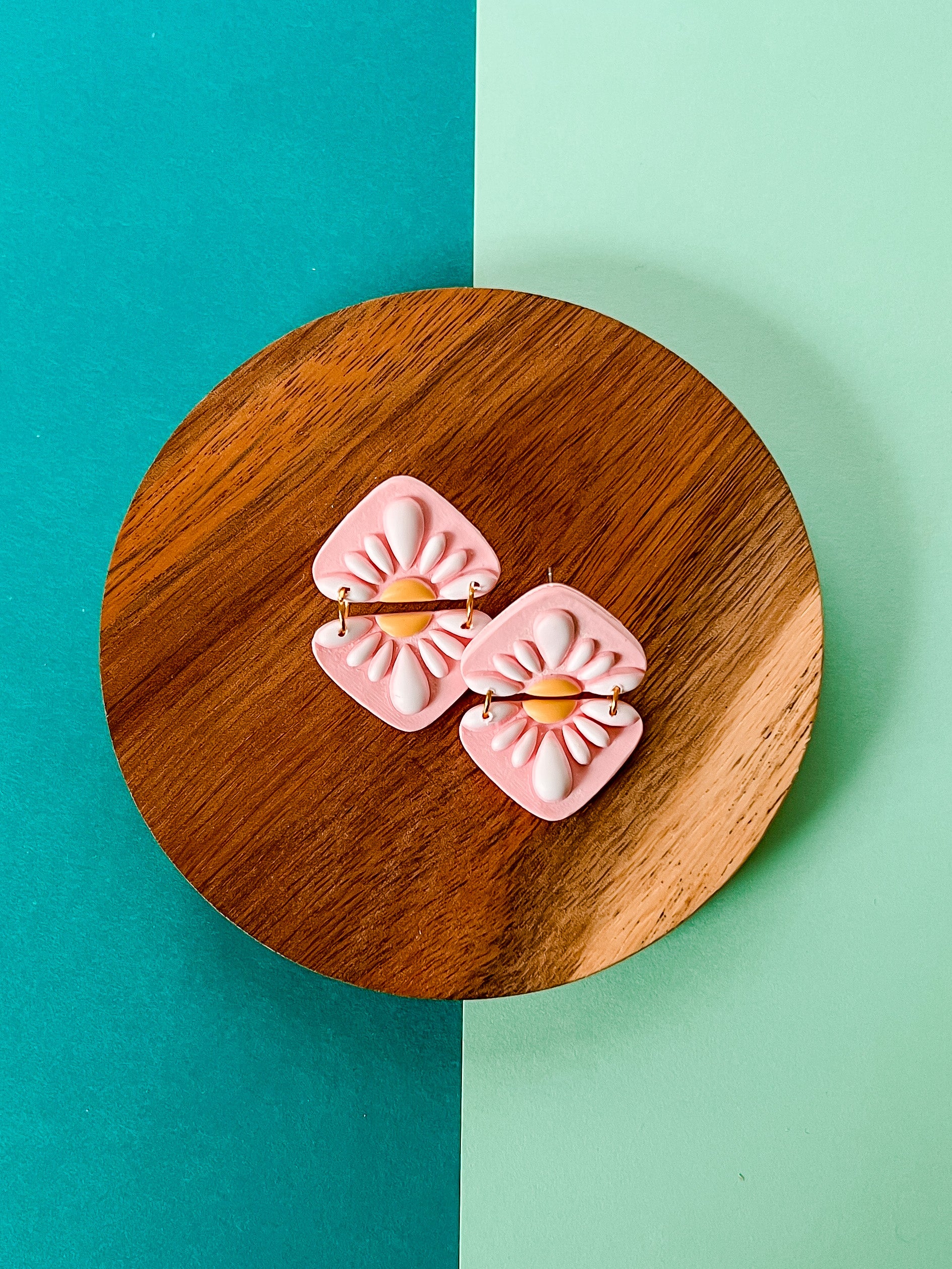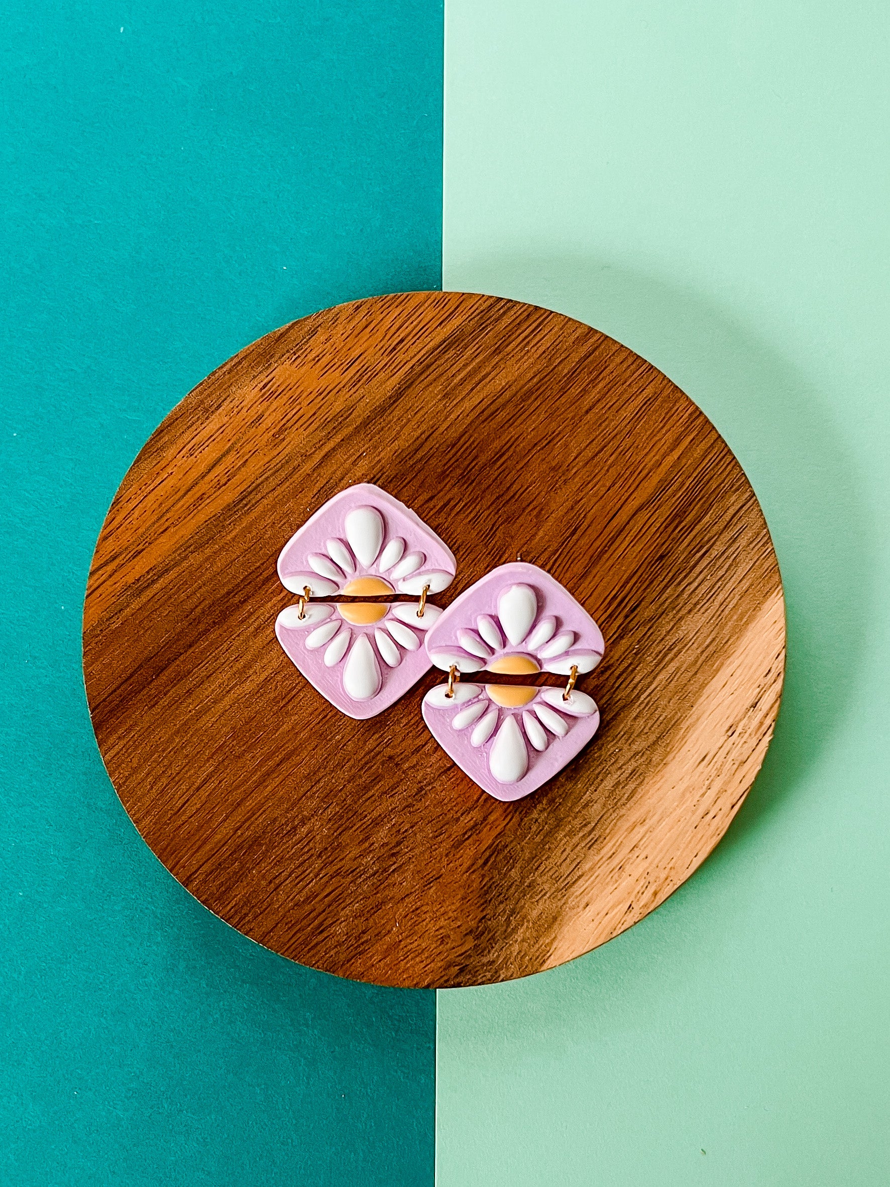 Our earrings are handmade in Greenville. South Carolina. Each item will have small variations and possible imperfections. Clay earrings are made start to finish from a block of clay. Each piece is unique. Each item is lovingly rolled out, cut, baked, sanded and assembled by hand from polymer clay.