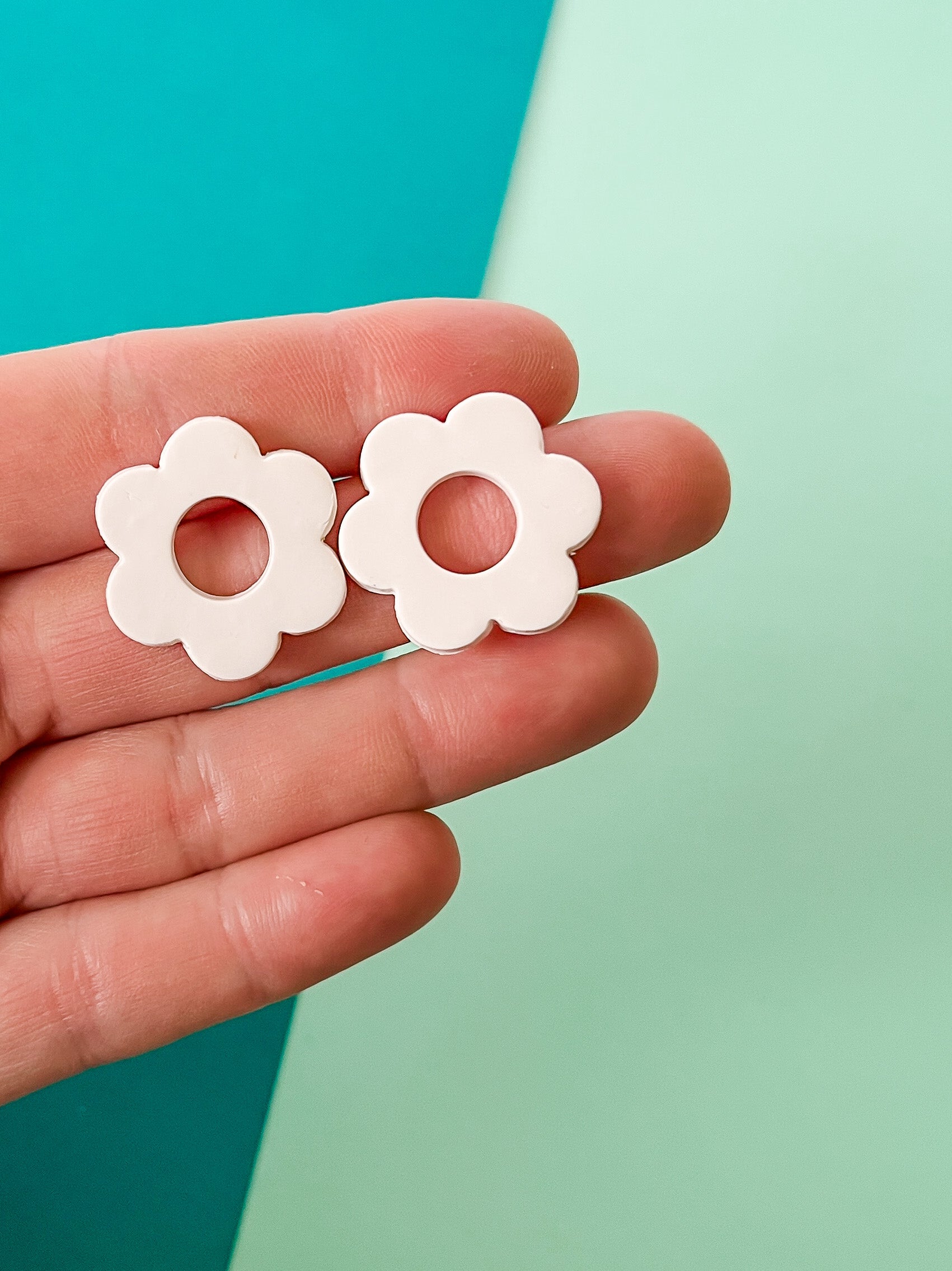 Our earrings are handmade in Greenville. South Carolina. Each item will have small variations and possible imperfections. Clay earrings are made start to finish from a block of clay. Each piece is unique. Each item is lovingly rolled out, cut, baked, sanded and assembled by hand from polymer clay.