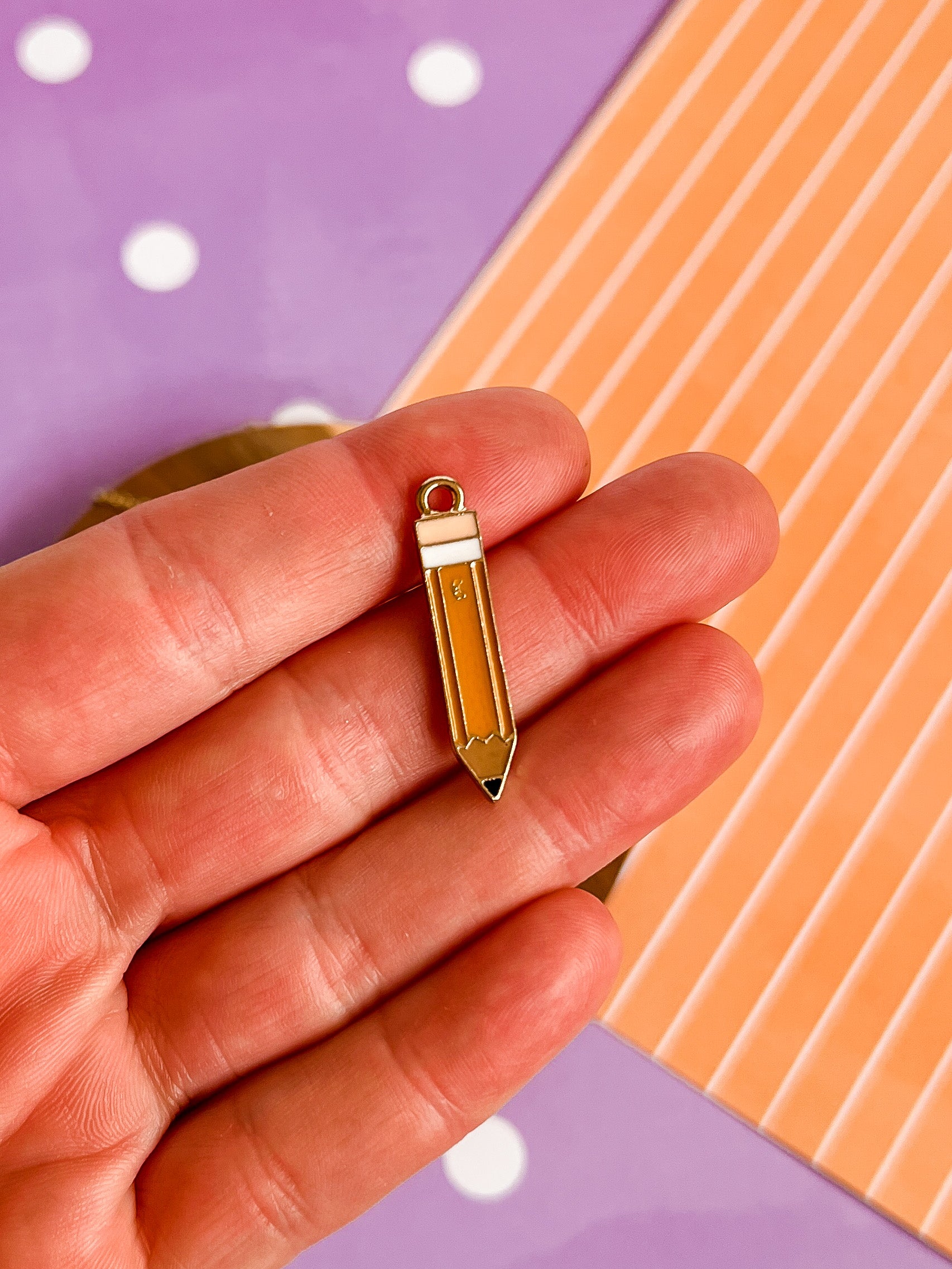 This is our Penny the Pencil set! She comes on a 16" gold plated chain, earrings (even clip ons!) or the whole set. If you need a different necklace length send us an email or let us know at check out!